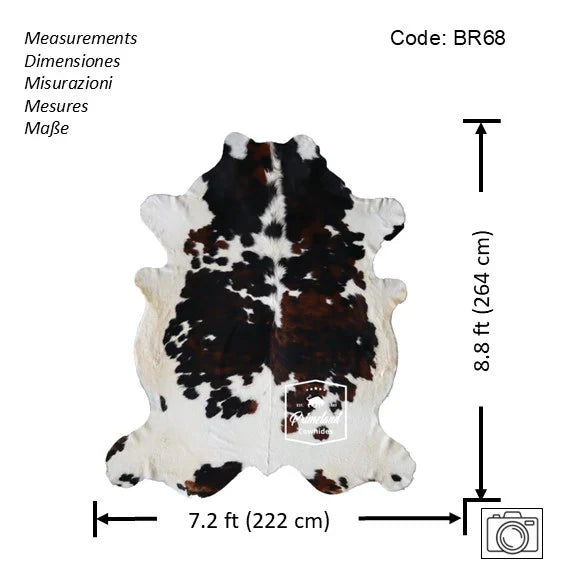 You will receive the exact cowhide rug shown in the pictures. - Size: X-Jumbo(XXL). - Measurements: Length: 8.8 ft (264 cm) - Width:7.2 ft (222 cm) Please see the picture with the measurements. - Code: BR68 - Individually selected and inspected to meet our high quality standards. - Durable and long lasting item. - Authentic 100% natural cowhide rug. - Minimum maintenance required....