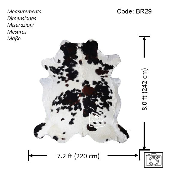 You will receive the exact cowhide rug shown in the pictures. - Size: X-Jumbo(XXL). - Measurements: Length: 8.0 ft (242 cm) - Width:7.2 ft (220 cm) Please see the picture with the measurements. - Code: BR29 - Individually selected and inspected to meet our high quality standards. - Durable and long lasting item. - Authentic 100% natural cowhide rug. - Minimum maintenance required....
