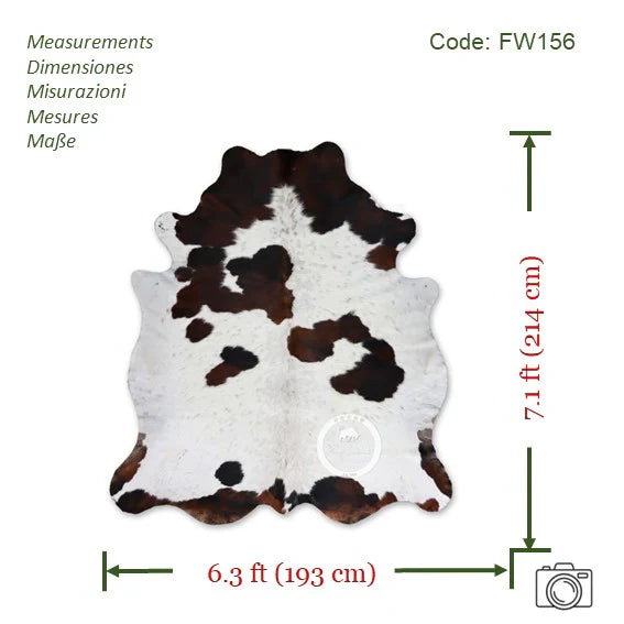 You will receive the exact cowhide rug shown in the pictures. - Size: Large (L). - Measurements: Length: 7.1 ft (214 cm) - Width:6.3 ft (193 cm) Please see the picture with the measurements. - Code: FW156 - Individually selected and inspected to meet our high quality standards. - Durable and long lasting item. - Authentic 100% natural cowhide rug. - Minimum maintenance...
