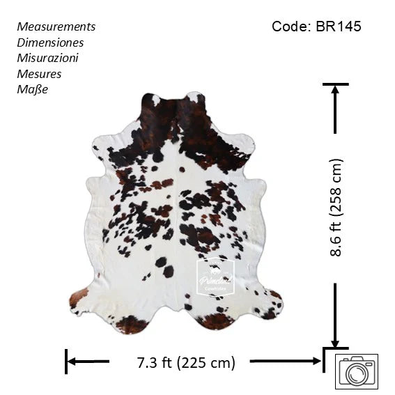 You will receive the exact cowhide rug shown in the pictures. - Size: X-Jumbo(XXL). - Measurements: Length: 8.6 ft (258 cm) - Width:7.3 ft (225 cm) Please see the picture with the measurements. - Code: BR145 - Individually selected and inspected to meet our high quality standards. - Durable and long lasting item. - Authentic 100% natural cowhide rug. - Minimum maintenance required....