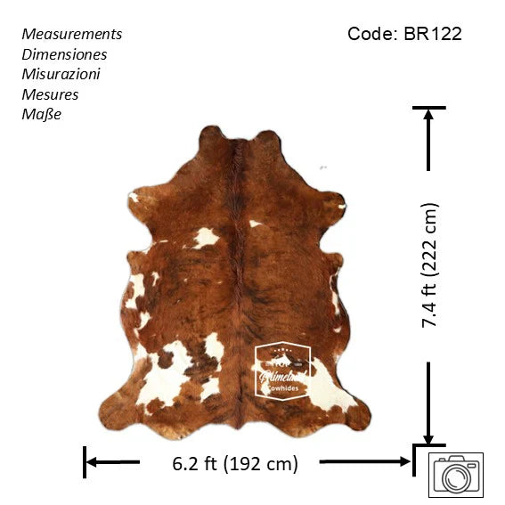 You will receive the exact cowhide rug shown in the pictures. - Size: Large(L). - Measurements: Length: 7.4 ft (222 cm) - Width:6.2 ft (192 cm) Please see the picture with the measurements. - Code: BR122 - Individually selected and inspected to meet our high quality standards. - Durable and long lasting item. - Authentic 100% natural cowhide rug. - Minimum maintenance required....