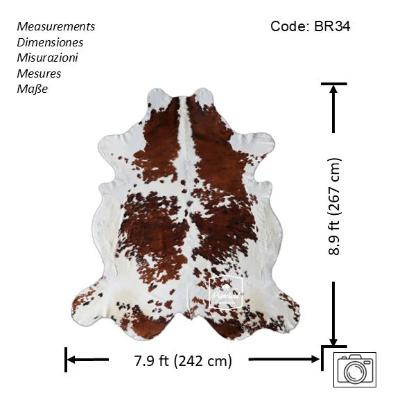 You will receive the exact cowhide rug shown in the pictures. - Size: X-Jumbo(XXL). - Measurements: Length: 8.9 ft (267 cm) - Width:7.9 ft (242 cm) Please see the picture with the measurements. - Code: BR34 - Individually selected and inspected to meet our high quality standards. - Durable and long lasting item. - Authentic 100% natural cowhide rug. - Minimum maintenance required....