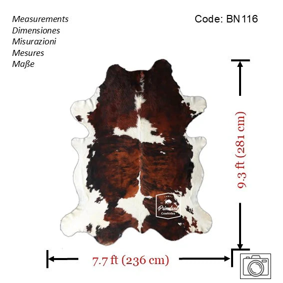 You will receive the exact cowhide rug shown in the pictures. - Size: X-Jumbo(XXL). - Measurements: Length: 9.3 ft (281 cm) - Width:7.7 ft (236 cm) Please see the picture with the measurements. - Code: BN116 - Individually selected and inspected to meet our high quality standards. - Durable and long lasting item. - Authentic 100% natural cowhide rug. - Minimum maintenance required....