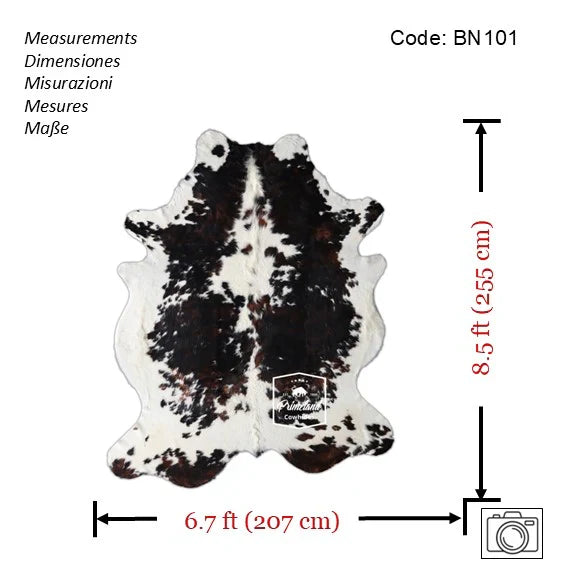 You will receive the exact cowhide rug shown in the pictures. - Size: X-Jumbo(XXL). - Measurements: Length: 8.5 ft (255 cm) - Width:6.7 ft (207 cm) Please see the picture with the measurements. - Code: BN101 - Individually selected and inspected to meet our high quality standards. - Durable and long lasting item. - Authentic 100% natural cowhide rug. - Minimum maintenance required....